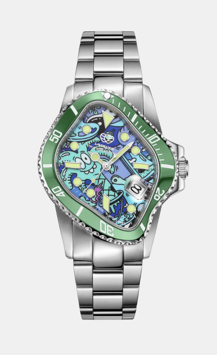 This timepiece draws inspiration from Steven Harrington's "Night & Day" series, depicting the beauty of night with a blend of blue and green hues. The watch captures the artist's view of the nighttime world, using vibrant colors to evoke a sense of peaceful solitude and mystery.