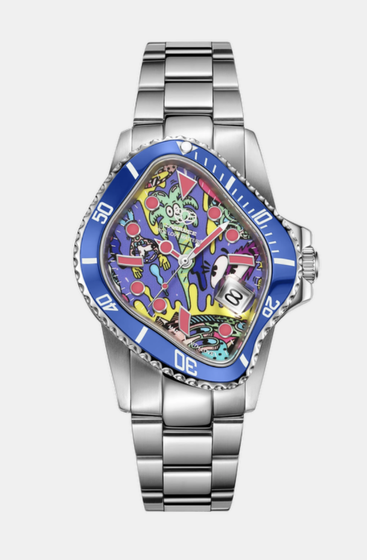 Inspired by Steven Harrington's "Getting Away" series, this timepiece features vibrant scenes and dynamic characters, symbolizing limitless creativity and the spirit of exploration.